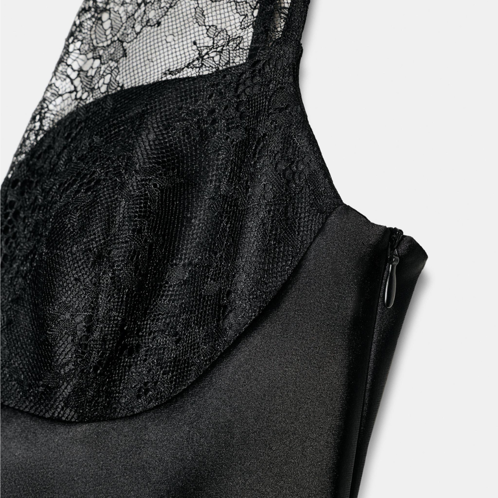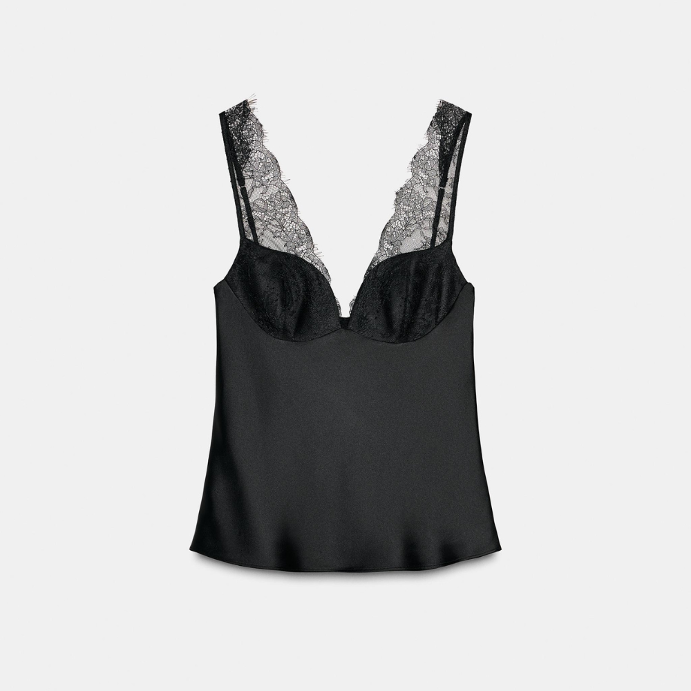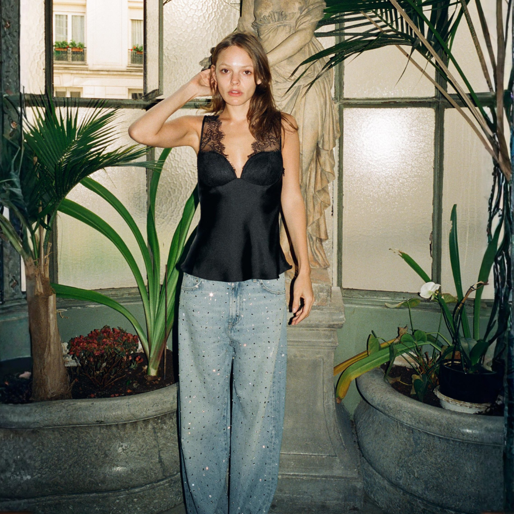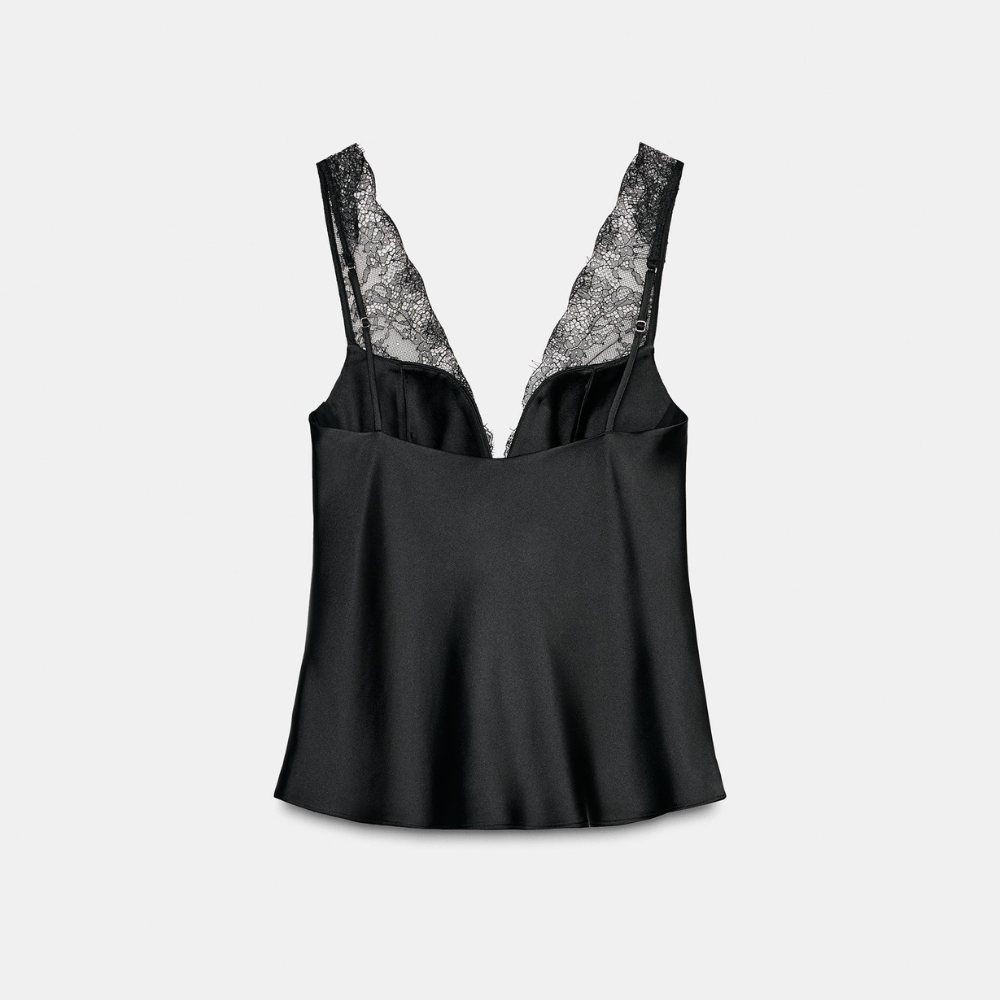 טופ סאטן זה עשוי מבד חלק בגימור סאטן וכולל צווארון מתוק עם עיטורי תחרה תואמים ורצועות דקות . הטופ כולל בטנה פנימית וסגירת רוכסן צד מוסתר בתפר לגימור נקי ואלגנטי.